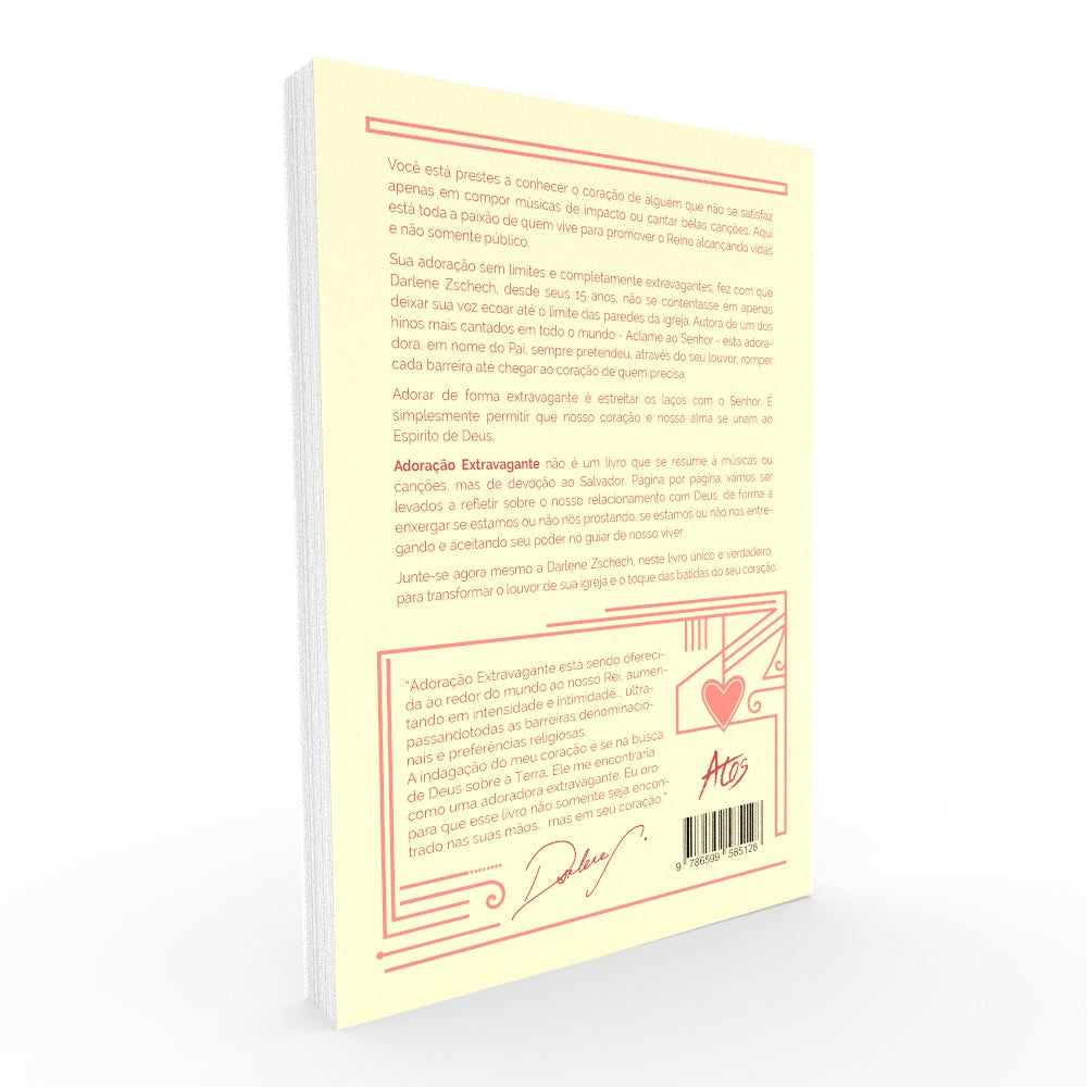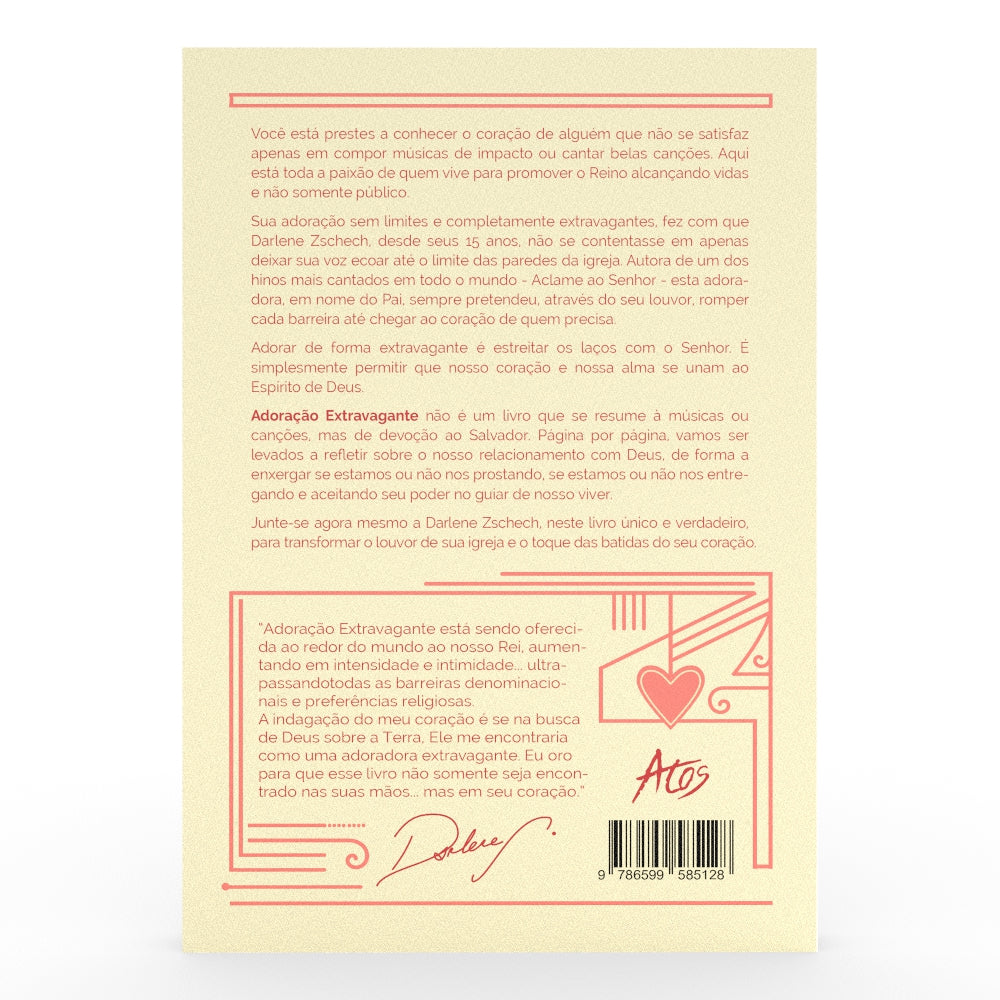 Você está prestes a conhecer o coração de alguém que não se satisfaz apenas em compor músicas de impacto ou cantar belas canções. Aqui está toda a paixão de quem vive para promover o Reino alcançando vidas e não somente público. Sua alegria sem limites e completamente extravagantes, fez com que Darlene Zschech, desde seus 15 anos, não se contentasse em apenas deixar sua voz ecoar até o limite das paredes da igreja. Autora de um dos hinos mais cantados em todo o mundo: - Aclame ao Senhor - esta adoradora, em nome do Pai, sempre pretendeu, através do seu louvor, romper cada barreira até ao coração de quem precisa. Adorar de forma extravagante é estreitar os laços com o Senhor. É simplesmente permitir que nosso coração e nossa alma se unam ao Espírito de Deus. Adoração Extravagante não é um livro que se resume a músicas ou canções, mas de devoção a Salvador. Página por página, vamos levar uma reflexão sobre nosso relacionamento com Deus, de forma a enxergar se estamos ou não nos prostrando, se estamos ou não nos entregando e aceitando seu poder no guiar de nosso viver. Junte-se agora mesmo a Darlene Zschech, neste livro único e verdadeiro, para transformar o louvor de sua igreja e o toque das batidas do seu coração. “Adoração Extravagante está sendo oferecida ao redor do mundo ao nosso Rei, aumentando em intensidade e intimidação... ultrapassando todas as barreiras denominacionais e preferências religiosas. A indagação do meu coração é se na busca de Deus sobre a Terra, Ele me encontraria como uma adoradora extravagante. Eu oro para que esse livro não somente seja encontrado nas suas mãos... mas em seu coração.” Darlene Zschech